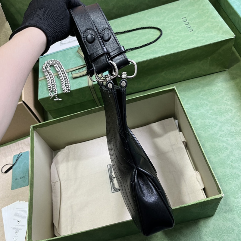 Gucci Blondie Collection Small Tote Bag. The round interlocking double G’s from the House’s iconic design are the heart of the Gucci Blondie collection. The Gucci Blondie is designed with a handle and chain shoulder strap, and features refined leather appliqué detailing to reinvigorate the heritage of the brand and give it a classic appeal. Black leather, cotton linen lining, round interlocking double G leather appliqués, interior: 3 main compartments and 1 zipped pocket, carry handle (15 cm high), chain shoulder strap (30 cm high). Weight: approx. 0.7 kgSize: 24 (L) x 30 (W) x 6 cm (D)Colour: black / original leather.