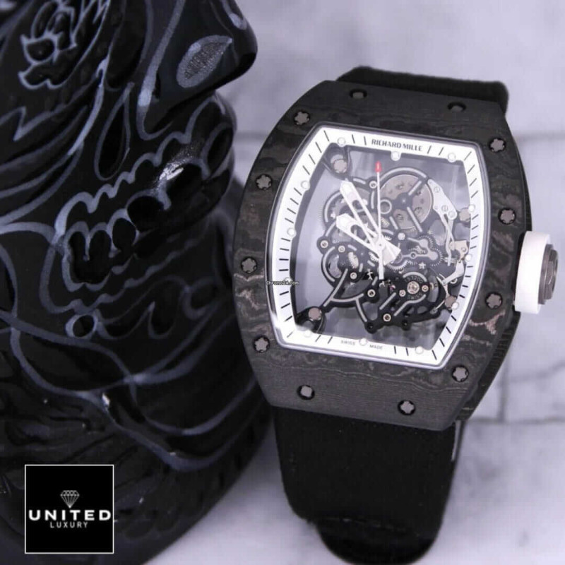 The Richard Mille RM055 White Legend Replica is a luxurious tourbillon watch with a sleek black NTPT Carbon Fiber case and bezel. It is powered by an automatic movement with a caliber of RM055 and a p...