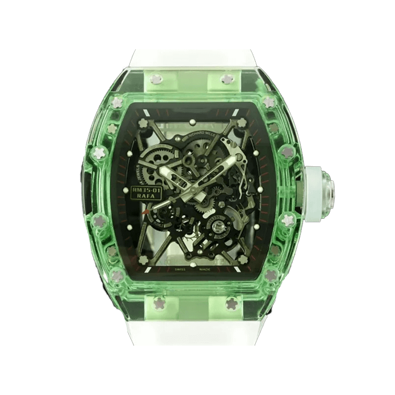 Richard Mille RM 35-01 Green is a bold and innovative timepiece that perfectly combines cutting-edge technology with high-performance materials. Designed for those who seek both technical excellence and striking aesthetics. this watch showcases Richard Mille’s expertise in crafting ultra-lightweight yet highly durable timepieces.At the core of the RM 35-01 Green is its skeletonized movement. housed within a 44.5mm tonneau-shaped case made from Carbon TPT® and Green Quartz TPT®. This advanced material not only enhances the watch’s visual appeal but also provides exceptional strength and shock resistance. making it ideal for extreme conditions. The vibrant green Quartz TPT® bezel and caseback further highlight its sporty and futuristic design.The dial features an open-worked design. allowing a clear view of the intricate mechanics within. A double sapphire crystal with an anti-reflective coating ensures durability and clarity. while luminous hands and markers provide excellent legibility in all lighting conditions.Powering the RM 35-01 Green is the Calibre RMUL3. a manual-winding movement with a skeletonized titanium baseplate and bridges. This construction ensures both rigidity and lightness while maintaining outstanding shock resistance. Designed for high-impact activities. the movement is built to withstand extreme forces without compromising precision.The watch is fitted with a matching green rubber strap. offering superior comfort and flexibility. The titanium folding clasp secures the watch firmly while complementing its sporty and dynamic aesthetic.In conclusion. the Richard Mille RM 35-01 Green is a true statement piece. combining advanced materials. high-performance engineering. and a striking colorway. Its lightweight construction. superior shock resistance. and bold design make it a standout choice for watch enthusiasts who demand the best in performance and exclusivity.
