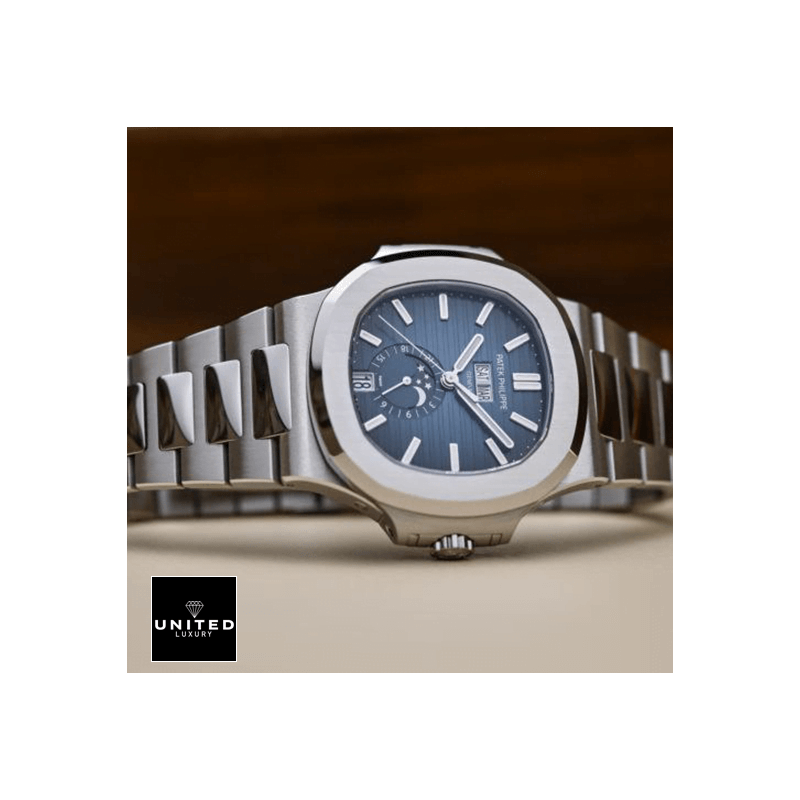 The Patek Philippe Blue Moon phase Replica is a high quality watch from the Nautilus family. It features an automatic movement with a caliber of 324 S QA LU 24H/303 and a power reserve of 60 hours. The precision of the watch is within COSC certification limits. with a sweep motion second hand. The case is made of 904L stainless steel and has a sapphire crystal. It is 40.50 mm in size and 11.30 mm in thickness. The bracelet is also made of 904L stainless steel and is adjustable for all sizes. The dial is blue with stick indices and stick hands made of stainless steel.The functions of the watch include hours. minutes. seconds. additional 24 hour hand. date. annual calendar. day. month. and moonphase. It has passed the 30m water resistance test and is protected by a full 2 year international warranty. This watch is a perfect 1:1 super clone Swiss mechanism watch and is indistinguishable from the authentic watch.