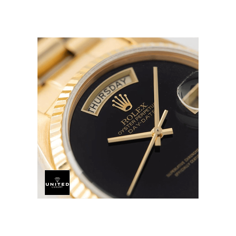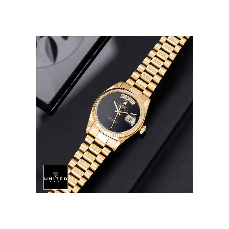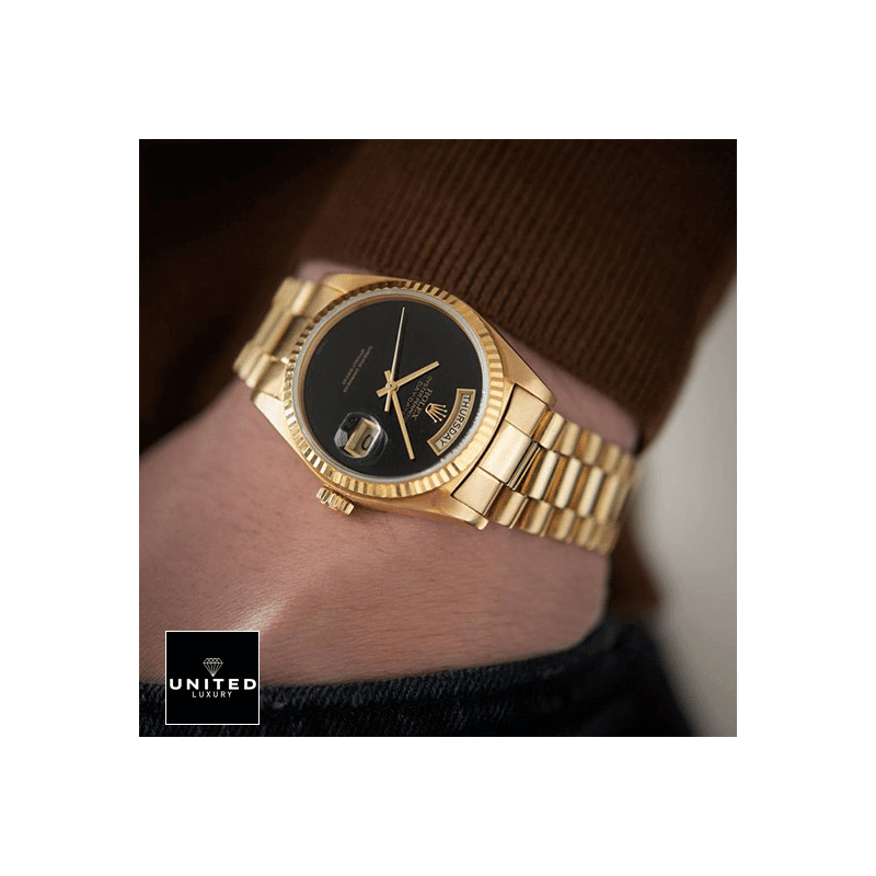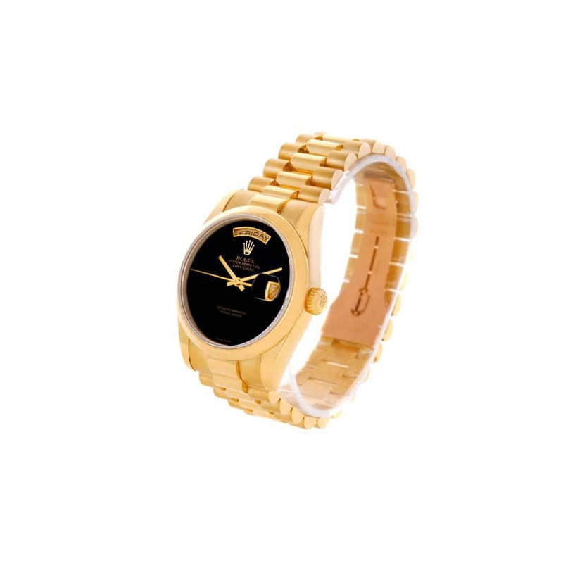 Immerse yourself in the luxurious world of horologywith the Rolex Day-Date Onyx Dial 18038 – Bulang Jubilee Replica. Combining timeless elegance with remarkable craftsmanship. this watch is more than a timepiece: it’s a statement. Crafted to mirror the prestigious Rolex design. this invites you to experience the splendor of a classic without compromising on quality or aesthetics.The exquisite 904L stainless steel case. adorned in a captivating yellow gold hue. catches and reflects light with a radiant gleam. promising durability and resilience. The sapphire crystal not only provides robust protection but adds a touch of sophistication. never losing its pristine clarity. Enveloped in the same high-grade stainless steel. the bracelet. with its adjustable link and folding clasp. rests comfortably and securely on the wrist. echoing the grandeur of the yellow gold color. ensuring that every glance at thisrolex onyx dialwill be a reminder of impeccable style.Gaze upon therolex replica dialand you will be captivated by the deep. mysterious blackness. perfectly balanced by the polished. stick hands also made from 904L stainless steel. The elegant simplicity of the dial. free of numerals. ensures an uncluttered and clear presentation of time. allowing the resplendent black onyx to take center stage.Beneath this refined exterior lies the heart of precision – the automatic caliber 3055 movement. With a robust power reserve of 60 hours and adhering to COSC certification limits. boasting a precision of -3/+3 sec/day. it exemplifies the blend of beauty and accuracy. Tested for 30m water resistance. it offers a reliable companion through everyday pursuits. And with the reassurance of a full 2 years International United Luxury warranty. every moment is confidently cherished.Envision yourself wearing this exceptional timepiece: its weight subtly reminding you of its presence. the smooth glide of its second hand. the seamless reflection of light as it passes. Whether at a formal gathering or a casual brunch. thisfake onyxdial Rolex replica transcends settings. making it the epitome of versatile luxury.With this impeccable imitation. you obtain not just a watch. but an experience – one where luxury. precision. and elegance meet. Owning the Rolex Day-Date Onyx Dial 18038 – Bulang Jubilee Replica means embracing the pinnacle of watchmaking excellence. Seize this outstanding creation and let it define your elegance. proving itself as the best choice for your discerning taste.