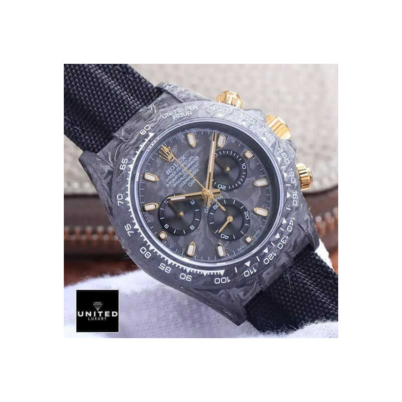 TheRolex Daytona DiW NTPT Carbon 46490 All Carbon Lemon Edition Replicais not just an ordinary timepiece; it’s a masterpiece crafted to perfection. capturing the essence of luxury and precision that Rolex is renowned for. This stunning watch presents itself with a bold. striking appearance thanks to its 904L stainless steel case and bezel. both cloaked in a hypnotic forged carbon color. As you admire its meticulously designed sapphire crystal. you’ll notice the impeccable clarity and scratch resistance that ensures your watch remains pristine and elegant.Imagine the feeling of securing this artifact to your wrist with the exquisitely crafted fabric bracelet. adjustable for the perfect fit. and fastened with a robust steel pin buckle clasp. The dial. shimmering in forged carbon. features sophisticated stick and dot hour markers alongside sleek stick hands. ensuring that time-telling is not just an action but an experience of refined precision.Inside this luxurious encasement beats the heart of the watch – the automatic 7750 caliber movement. This powerful movement ensures exceptional accuracy. adhering to COSC certification limits with a precision of -3/+3 seconds per day. Imagine the confidence that comes with knowing your watch boasts a remarkable 60-hour power reserve. allowing it to power through your busiest days without losing its fervor. The smooth sweep second hand exemplifies the flawless motion only seen in top-tier timepieces.Beyond its dazzling appearance. theRolex Daytona DiW NTPT Carbon 46490 All Carbon Lemon Edition Replicais designed for practicality and resilience. With a water-resistant depth of up to 30 meters. you can face daily adventures without hesitation. This perfect 1:1 clone of the original Rolex Daytona ensures you possess a watch so authentically replicated that even a jeweler will be left in awe of its craftsmanship. The 2-year international warranty only solidifies your investment. offering peace of mind with your purchase.For those in pursuit of the. theRolex Daytona DiW NTPT Carbon 46490 All Carbon Lemon Edition Replicastands unrivaled. It seamlessly combines robust engineering with an aesthetic that seduces the senses. making it an essential addition for any connoisseur’s collection. Indulge in the relentless pursuit of excellence with a timepiece that doesn’t just tell time. but tells a story of luxury and precision.