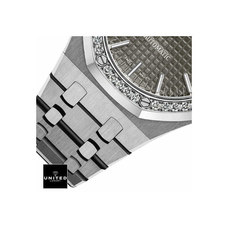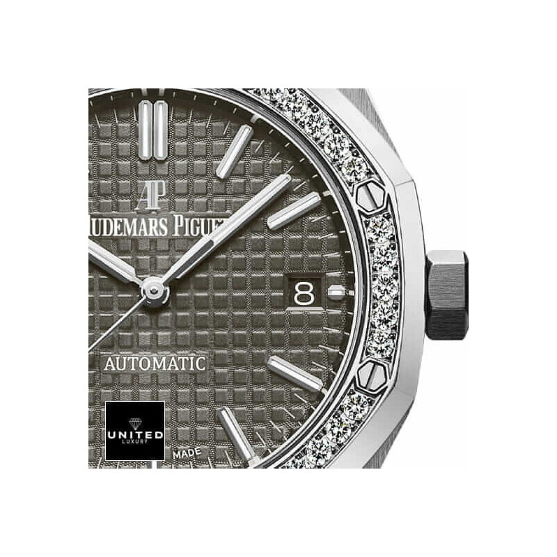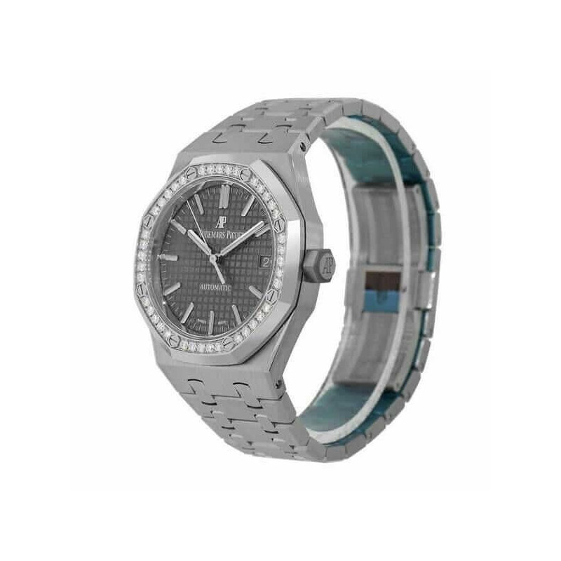 The Audemars Piguet Royal Oak 15451ST.ZZ.1256ST.02 is a luxury replica watch. It features an automatic movement with a caliber AP 3120 and a power reserve of 60 hours. It is certified within COSC limits for precision of -3/+3 seconds per day. The case is made of 904L stainless steel and has a sapphire crystal. The bezel is also made of 904L stainless steel and is gem set. The size of the case is 37.00 mm and it is 9.08 mm thick.The bracelet is also made of 904L stainless steel and is adjustable for all sizes. It has a fold clasp made of 904L stainless steel. The dial is nicknamed the Grande Tapisserie and is grey in color. It has stick and dot indices and the hour markers are made of 904L stainless steel. The hands are also made of 904L stainless steel and are stick type. The watch has the functions of hours. minutes. seconds. and date. It has passed the 30m water resistance test and is protected by a full 2 year international warranty. This watch is a perfect 1:1 super clone Swiss mechanism watch and even your jeweler won’t be able to tell the difference!