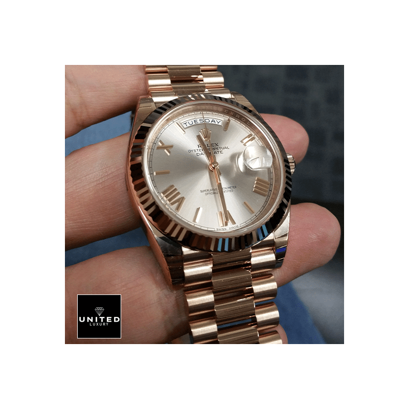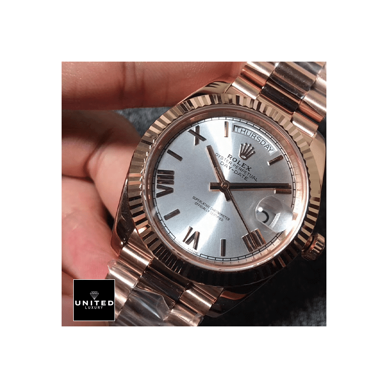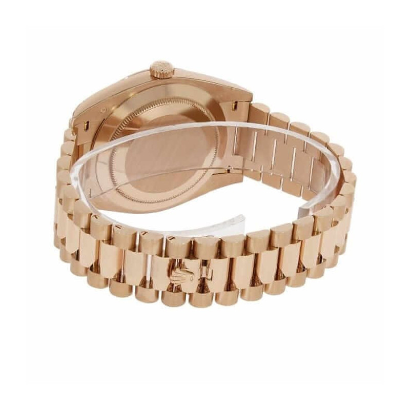 Indulge in the epitome of luxury and precision with theRolex Day-Date 228235 AR Rose Gold Wrapped Rhodium Dial Replica. This exceptional timepiece effortlessly combines the timeless elegance of its design with the innovative craftsmanship that Rolex is celebrated for. Imagine the delicate. yet robust. rose gold hue catching the light as you make a statement with every subtle turn of your wrist.Carefully designed for the modern connoisseur. this features an automatic movement powered by the Caliber 3255. renowned for its reliability and precision. With a remarkable power reserve of 60 hours. this watch promises to keep ticking with exceptional accuracy. Enrobed in lustrous rose gold. the 904L stainless steel case and bezel possess an alluring blend of durability and elegance. perfectly matched by the shimmering sapphire crystal that guards the stunning dial beneath.The 40.00 mm case size strikes a perfect balance. presenting a commanding presence without being overly bold. The bracelet. crafted from the same high-grade 904L stainless steel and rose gold. offers an Oyster type construction with adjustable links. ensuring a snug and comfortable fit on any wrist. The dial. affectionately named Sundust. boasts a captivating grey hue. accentuated by Roman numerals that add a touch of classical sophistication. Stick-type hands precisely mark the hours. minutes. and seconds. traversing the exquisitely finished surface.Beyond its breathtaking appearance. this watch is a marvel of functionality. It features hours. minutes. seconds. date. and chronometer functions. all within a streamlined design. The sweep motion second hand glides smoothly. a testament to the high-quality craftsmanship synonymous with Rolex. The watch is also certified within COSC limits. ensuring its timekeeping prowess. With a 30-meter water resistance. it is poised to withstand the rigors of daily wear while offering peace of mind.Each aspect of this timepiece has been meticulously replicated to mirror the authentic Day-Date model. The serial numbers. font. punctuation. and finishing on the writings and markings are indistinguishable from the original. To complete the experience. the watch comes protected by a comprehensive 2-year International United Luxury warranty. providing unparalleled confidence in your investment.Immerse yourself in the luxury and precision of theRolex Day-Date 228235 AR Rose Gold Wrapped Rhodium Dial Replica. and let it become an integral part of your style narrative. This watch is not just a statement of elegance; it is a testament to the intricate dance between heritage and innovation.