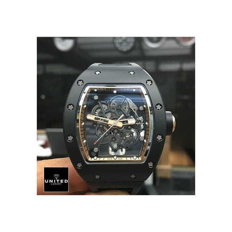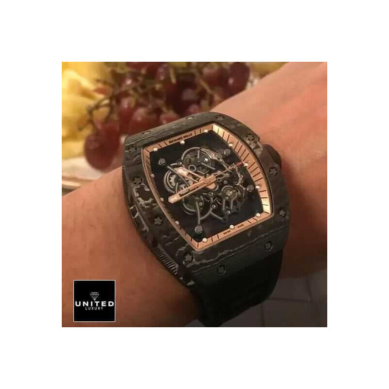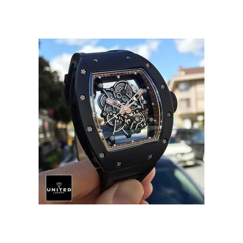 The Richard Mille RM055 Bubba Watson Replica is a luxurious watch with a sleek black design. It features an automatic movement with a caliber RM 55 and a power reserve of 60 hours. The precision of the watch is within COSC certification limits. with a sweep motion second hand. The case is made of 904L stainless steel and has a sapphire crystal. The bracelet is made of rubber and has adjustable links for all sizes. The dial is transparent with stick and dot indices. and the hands are made of 904L stainless steel.The watch is water-resistant and has passed the 30m water resistance test. It also has the same arrangeable serial numbers and cards. font. punto. and finishing for writings and markings as the authentic watch. It is protected by a full 2 years International United Luxury warranty. Japanese Mechanism watches may have different materials and movements. so customers should contact the support team for more information.