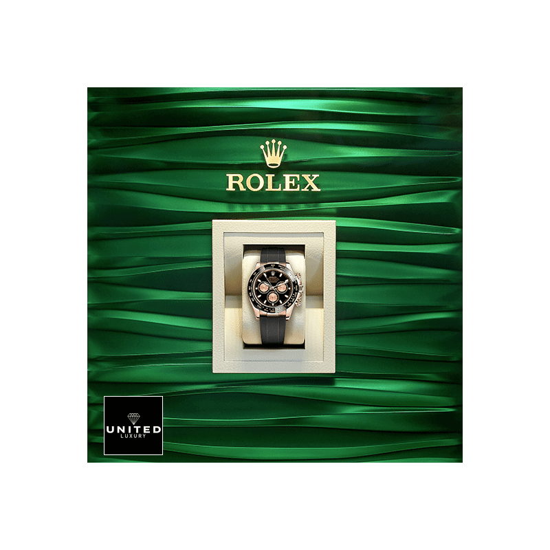 ‘DESCRIPTIONThis Rolex Daytona Cosmograph Automatic Rose Gold 116515LN-0012 Replica is a stunning watch. It features a 904L stainless steel case with a black and rose gold bezel. and a sapphire crystal. The movement is an automatic caliber 4130 with a 60-hour power reserve and precision of -3/+3 sec/day within COSC certification limits. The second hand has a sweep motion. The bracelet is made of rubber with adjustable links and a 904L stainless steel fold clasp in rose gold. The dial is black with stick and dot indices. and 904L stainless steel stick hands. The watch has chronograph. column wheel. and chronometer functions. and has passed the 30m water resistance test.This replica is a perfect 1:1 copy of the original. with the same serial numbers and cards. font. punto. and finishing for writings and markings. thickness and size. and powerful movement and caliber. It is protected by a full 2 years International United Luxury warranty. For Japanese Mechanism watches. materials and movements may differ from the Swiss Mechanism watches. so please contact our support team for more information and videos.GALLERY