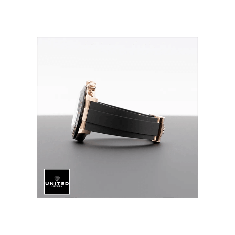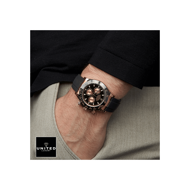 ‘DESCRIPTIONThis Rolex Daytona Cosmograph Automatic Rose Gold 116515LN-0012 Replica is a stunning watch. It features a 904L stainless steel case with a black and rose gold bezel. and a sapphire crystal. The movement is an automatic caliber 4130 with a 60-hour power reserve and precision of -3/+3 sec/day within COSC certification limits. The second hand has a sweep motion. The bracelet is made of rubber with adjustable links and a 904L stainless steel fold clasp in rose gold. The dial is black with stick and dot indices. and 904L stainless steel stick hands. The watch has chronograph. column wheel. and chronometer functions. and has passed the 30m water resistance test.This replica is a perfect 1:1 copy of the original. with the same serial numbers and cards. font. punto. and finishing for writings and markings. thickness and size. and powerful movement and caliber. It is protected by a full 2 years International United Luxury warranty. For Japanese Mechanism watches. materials and movements may differ from the Swiss Mechanism watches. so please contact our support team for more information and videos.GALLERY