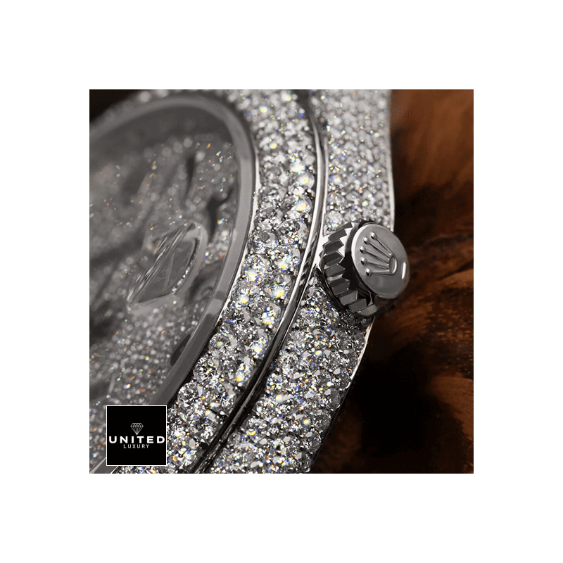 TheRolex Datejust 116300 White Gold Diamond Arabic Dial Iced Out Replicais a beacon of sophisticated craftsmanship and timeless elegance. meticulously designed to catch the eye and capture the heart. This exquisite timepiece is crafted to perfection. mirroring the grandeur and precision of the original Rolex Datejust with an alluring twist. Imagine the subtle weight of its 904L stainless steel case and bezel against your wrist. the gleam of its gem-set design twinkling under any light. and the cold. smooth touch of its sapphire crystal. a robust 41.00 mm masterpiece that provides an unclouded view of the stunning Arabic numerals on the dial.As you fasten the adjustable 904L stainless steel Oyster bracelet. also adorned with carefully set gems. feel the seamless integration of the watch clasp. ensuring a snug yet comfortable fit. The brilliance of the diamonds is matched only by the precision and power residing within. TheAutomatic 3136 caliber movementgrants a 60-hour power reserve. promising an accessory that stays as reliable as it is stylish. Each tick comes with a promise of precision. maintained within (-3/+3 sec/day) COSC certification limits. showcasing an uncanny dedication to accuracy.This replica isn’t just about aesthetics; it offers practical benefits too. Take a moment to appreciate the 30m water resistance. ensuring resilience against splashes and brief immersions. With a reassuring 2-year international warranty. confidence accompanies every glance at this piece. Whether you’re attending a black-tie event or presenting a business proposal. thisRolex Datejust 116300 reproductionmaintains an untouched grace and dependability.Owning this means not only possessing a stunning watch but also making a statement about your taste. values. and appreciation for the finer details in life. The shimmering diamonds and impeccable craftsmanship create a narrative of opulence and sophistication that is bound to captivate and impress onlookers. Choose a timepiece that doesn’t just tell time but tells a story of elegance and tradition. echoing the legacy of Rolex craftsmanship with each passing second.