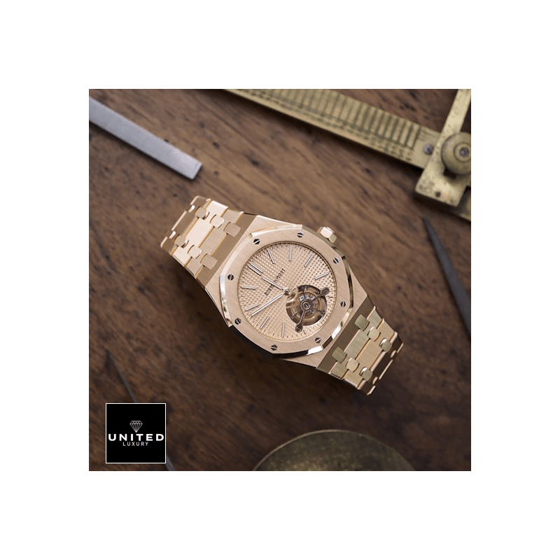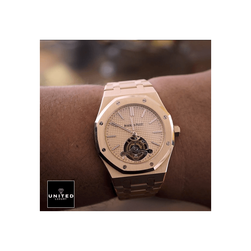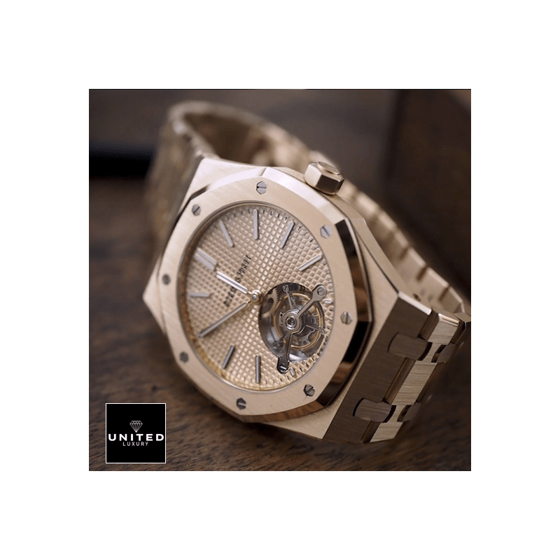 The Royal Oak Tourbillon Replica from Audemars Piguet is a striking watch. It features a 904L stainless steel case and bezel in a pink gold color. with a sapphire crystal for added protection. The mov...