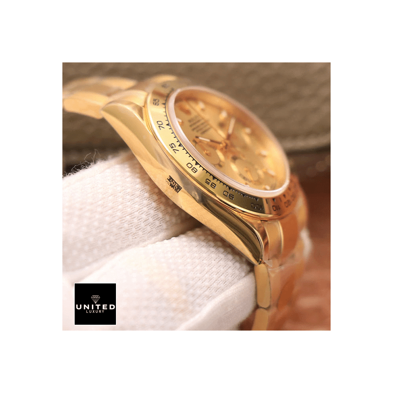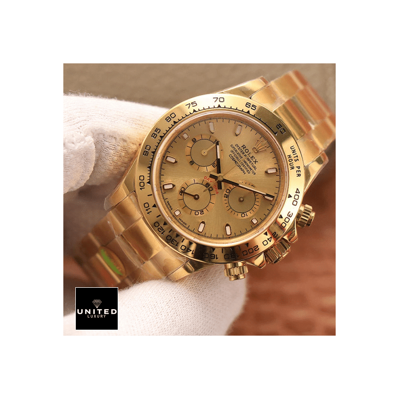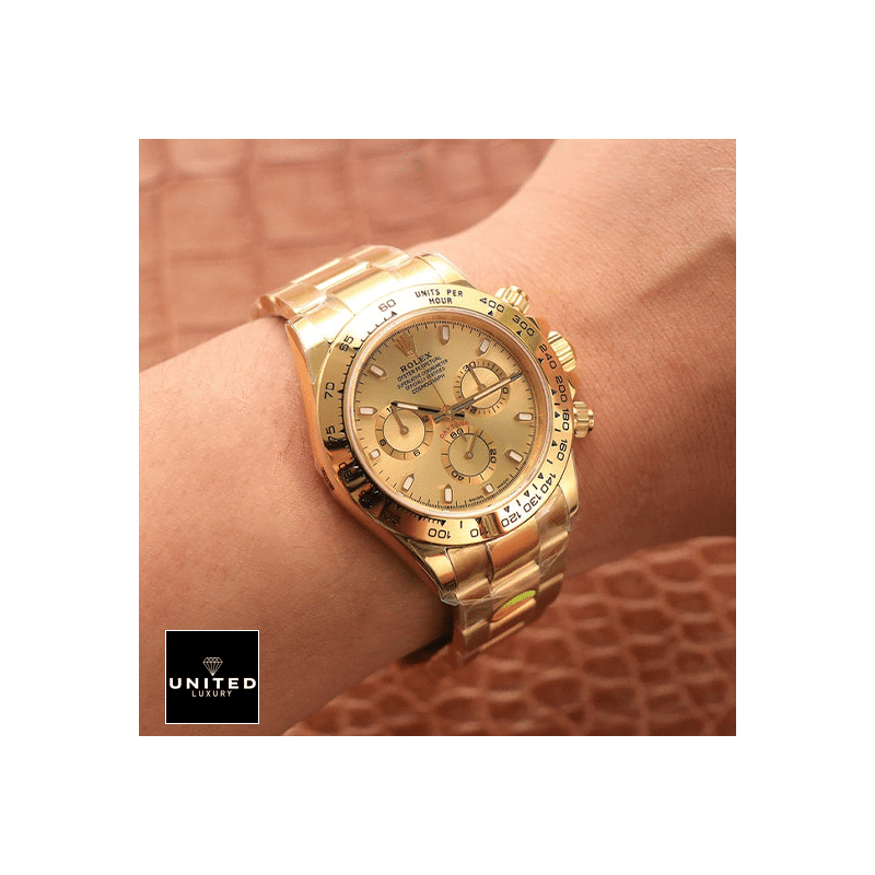 ‘DESCRIPTIONThe Rolex Daytona Cosmograph Yellow Gold Dial 116528 Oyster Replica is a luxurious watch that is sure to turn heads. It features a 904L stainless steel case with a yellow gold color and a 904L stainless steel bezel with the same color. The crystal is made of sapphire and the size is 40.00 mm. The bracelet is also made of 904L stainless steel and is adjustable for all sizes. The dial is champagne in color and features stick and dot indices. The hands are made of 904L stainless steel and are stick-shaped.The watch is powered by an automatic Rolex 4030 movement with a 60-hour power reserve and a precision of -3/+3 sec/day within COSC certification limits. It also features a sweep motion second hand. The watch is water-resistant up to 30m and comes with a full 2-year international warranty. It is a perfect replica of the original. with the same arrangeable serial numbers and cards. font. punto. and finishing for writings and markings. thickness. and size.GALLERY