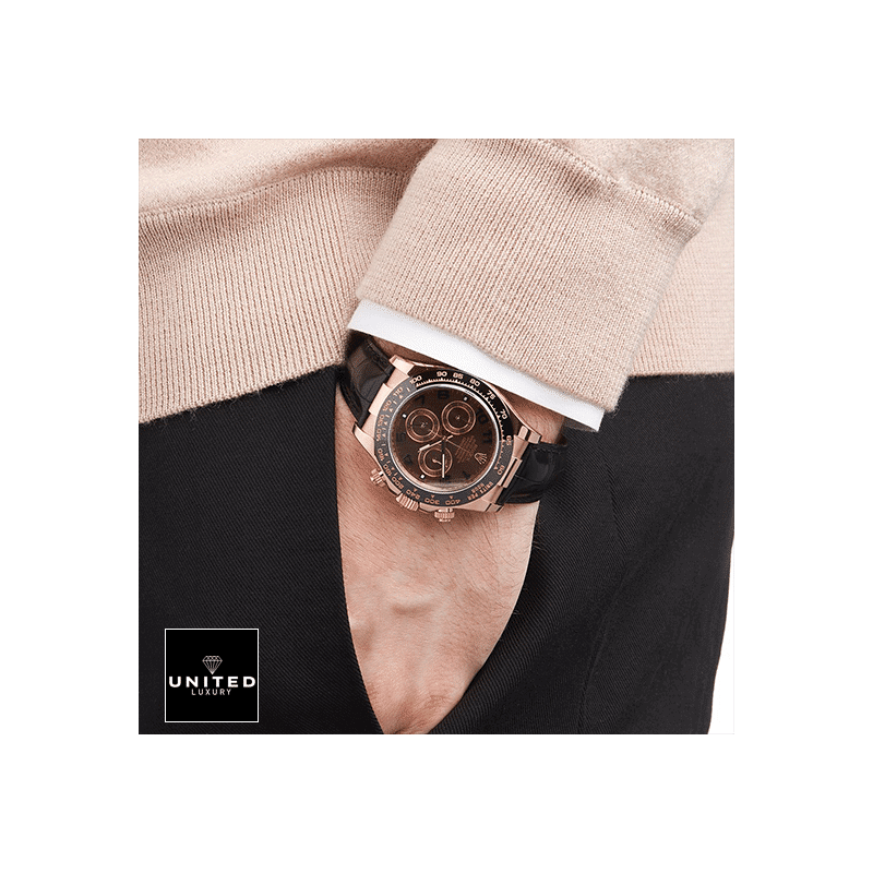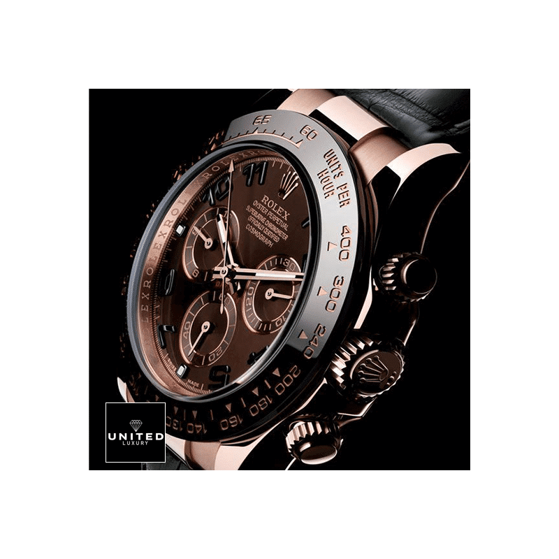 This Rolex Daytona Cosmograph 116515LNBR Rose Gold Black Dial Replica is a stunning watch. It features a 904L stainless steel case with a rose gold color and a black bezel. The sapphire crystal is 40.00 mm in size and 13.00 mm in thickness. The crocodile skin bracelet is adjustable and features a double-fold clasp in rose gold. The brown dial has Arabic numerals and 904L stainless steel hour markers and hands.The movement is an automatic Rolex 4030 with a power reserve of 60 hours and a precision of (-3/+3 sec/day) within COSC certification limits. It has passed the 30m water resistance test and is protected by a full 2 years International United Luxury warranty. This watch is a perfect replica of the original. with the same serial numbers. writings. markings. thickness. size. and movement. It is truly a work of art.