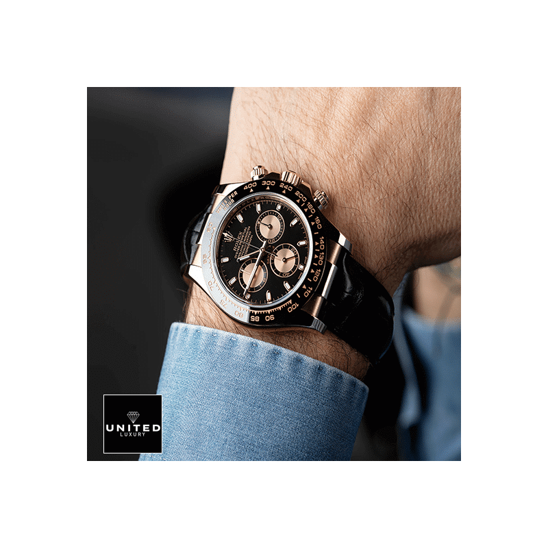 This Rolex Daytona Cosmograph 116515LNBR Rose Gold Black Dial Replica is a stunning watch. It features a 904L stainless steel case with a rose gold color and a black bezel. The sapphire crystal is 40.00 mm in size and 13.00 mm in thickness. The crocodile skin bracelet is adjustable and features a double-fold clasp in rose gold. The brown dial has Arabic numerals and 904L stainless steel hour markers and hands.The movement is an automatic Rolex 4030 with a power reserve of 60 hours and a precision of (-3/+3 sec/day) within COSC certification limits. It has passed the 30m water resistance test and is protected by a full 2 years International United Luxury warranty. This watch is a perfect replica of the original. with the same serial numbers. writings. markings. thickness. size. and movement. It is truly a work of art.