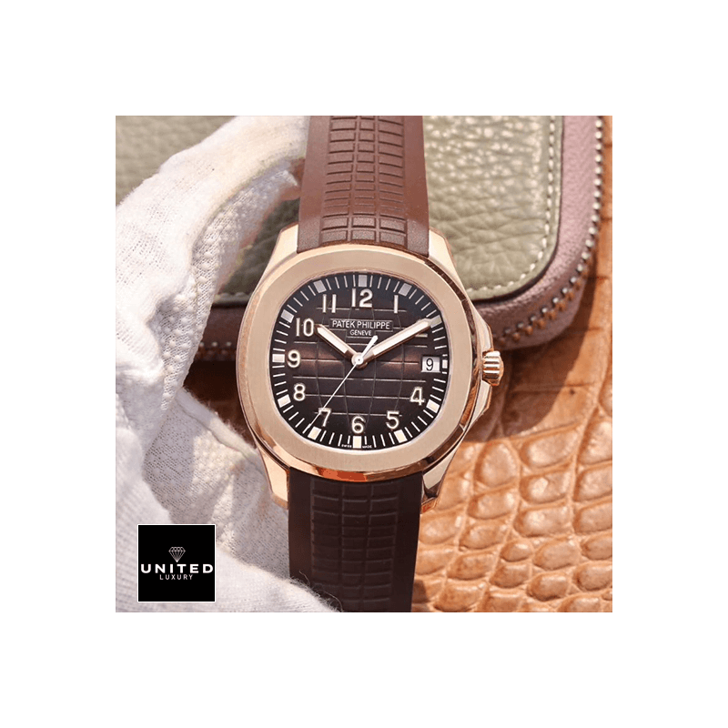 ‘DESCRIPTIONThis Patek Philippe Gold Brown Strap Replica is a high quality watch. It features a 904L stainless steel case with a rose gold color and a sapphire crystal. The movement is an automatic caliber 324 S C with a power reserve of 60 hours and a precision of (-3/+3 sec/day) within COSC certification limits. The second hand has a sweep motion.The bracelet is made of rubber with an adjustable link and a 904L stainless steel fold clasp in steel color. The dial is brown with stick/dot indices and Patek Philippe hour-markers. The hands are stainless steel stick type. It has passed the 30m water resistance test and comes with a full 2 years International United Luxury warranty. This watch is a perfect 1:1 super clone Swiss mechanism watch and is indistinguishable from the genuine article.GALLERY