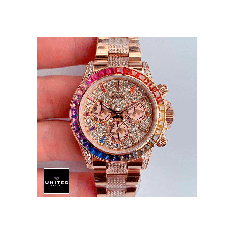 TheRolex Daytona Rainbow replicais a watch that every collector should have. It is a luxurious and eye-catching watch that will impress everyone. This super clonemodel is available in three case materials: yellow gold. white gold. and everose gold. Each variation features a rainbow dial with different stone shines. adding to its stunning appeal.The yellow gold option offake rainbow Rolexoffers a classic and traditional look. The warm and inviting case pairs well with various outfits. On the other hand. the white gold case provides a more modern and sophisticated appearance. The bright and eye-catching white gold case makes a statement. Lastly. the rose gold touch is a unique and luxurious choice. This yellow gold and copper blend results in a warm and rosy hue.The model boasts an iced out diamond lacquer dial with rainbow-colored sapphire hour markers. The baguette-cut hour markers sparkle brilliantly in the light. Additionally. the dial features three chronograph sub-dials on different setups and constructions.TheRolex rainbow replicasensure precise timekeeping for many years. powered by a reliable and accurate Swiss automatic movement. It is also water-resistant up to 100 meters. allowing you to wear it while swimming or showering. Fake rainbow Rolexes have a stainless steel case. a rainbow bezel. a sapphire crystal. and a size of 40.00 mm with a thickness of 12.4mm. The movement is automatic and has a power reserve of 60 hours. It is precise within -3/+3 sec/day. as certified by COSC.These models are some of theavailable at our shop. They feature a stunning design with luxurious elements. Its rainbow-themed dials. hour markers. and bezel add to its eye-catching appeal. With its Swiss automatic movement. it offers reliable and accurate timekeeping. Combining style and functionality. this timepiece is a beautiful and fancy option that will draw attention. They are essential to a collection at United Luxury. with a 2-year warranty on Swiss movements.GALLERYTheRolex Daytona Rainbow replicais a watch that every collector should have. It is a luxurious and eye-catching watch that will impress everyone. This super clonemodel is available in three case materials: yellow gold. white gold. and everose gold. Each variation features a rainbow dial with different stone shines. adding to its stunning appeal.The yellow gold option offake rainbow Rolexoffers a classic and traditional look. The warm and inviting case pairs well with various outfits. On the other hand. the white gold case provides a more modern and sophisticated appearance. The bright and eye-catching white gold case makes a statement. Lastly. the rose gold touch is a unique and luxurious choice. This yellow gold and copper blend results in a warm and rosy hue.The model boasts an iced out diamond lacquer dial with rainbow-colored sapphire hour markers. The baguette-cut hour markers sparkle brilliantly in the light. Additionally. the dial features three chronograph sub-dials on different setups and constructions.TheRolex rainbow replicasensure precise timekeeping for many years. powered by a reliable and accurate Swiss automatic movement. It is also water-resistant up to 100 meters. allowing you to wear it while swimming or showering. Fake rainbow Rolexes have a stainless steel case. a rainbow bezel. a sapphire crystal. and a size of 40.00 mm with a thickness of 12.4mm. The movement is automatic and has a power reserve of 60 hours. It is precise within -3/+3 sec/day. as certified by COSC.These models are some of theavailable at our shop. They feature a stunning design with luxurious elements. Its rainbow-themed dials. hour markers. and bezel add to its eye-catching appeal. With its Swiss automatic movement. it offers reliable and accurate timekeeping. Combining style and functionality. this timepiece is a beautiful and fancy option that will draw attention. They are essential to a collection at United Luxury. with a 2-year warranty on Swiss movements.GALLERY
