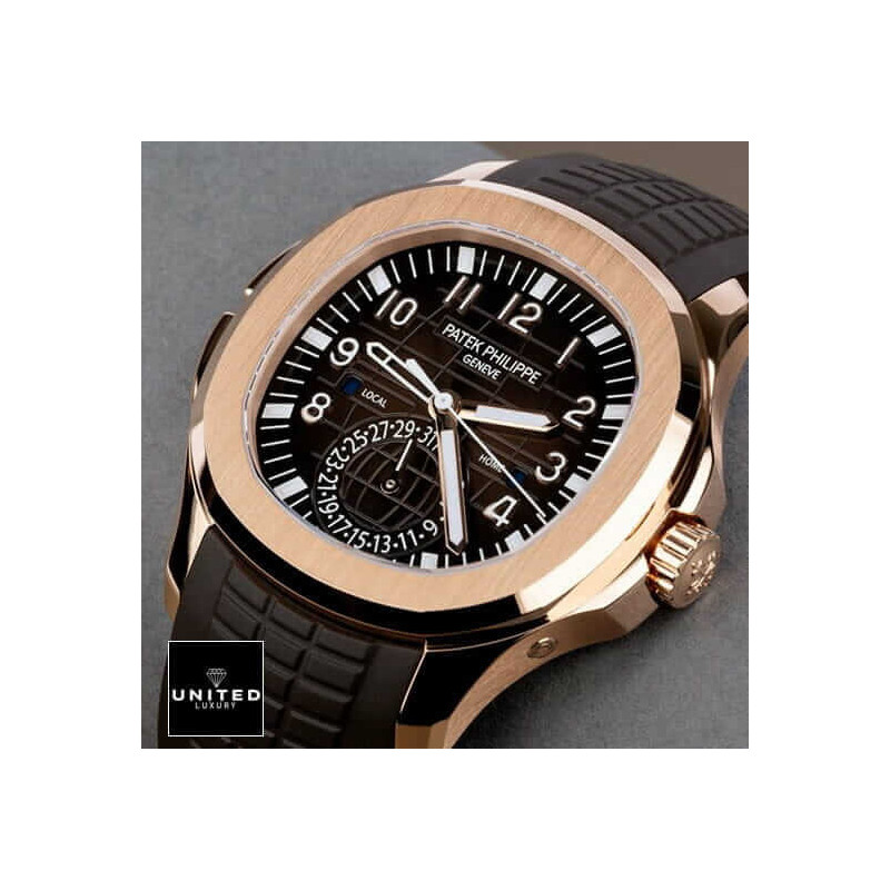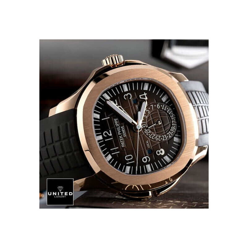 The Patek Philippe Aquanaut Travel Time Rose Gold 5164R-001 Replica is a high quality watch. It features a 904L stainless steel case and bezel in a rose gold color. with a sapphire crystal and a 40.80 mm size and 10.20 mm thickness. The movement is an automatic caliber 324 S C FUS with a power reserve of 60 hours and a precision of (-3/+3 sec/day) within COSC certification limits. The second hand has a sweep motion.The bracelet is made of rubber in a brown color. with adjustable links and a 904L stainless steel folding clasp in rose gold. The dial is brown with stick and dot indices. and 904L stainless steel stick hands. The watch has a variety of functions. including hours. minutes. seconds. an additional 12 hour hand (adjustable). and a day/night indication and date. It has passed the 30m water resistance test and is protected by a full 2 year international United Luxury warranty. This watch is a perfect 1:1 super clone Swiss mechanism watch. and even your jeweler won’t be able to tell the difference!