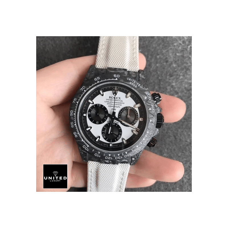 TheRolex Daytona Carbon Cosmograph Cream Dial 4130CR Replicais an exceptional timepiece. melding the iconic characteristics of the original Rolex Daytona with modern. cutting-edge materials and craftsmanship. This stunning watch stands out with its exquisite carbon case. which radiates an aura of sophistication and strength. The meticulously designed bezel. made from durable 904L stainless steel and coated in white gold and black. adds a touch of opulence and flair. making it an accessory that’s bound to turn heads.Imagine thecool. smoothfeel of the carbon case against your skin. paired with the sophisticatedgleamof the white gold-stainless steel bezel. creating an image of timeless elegance on your wrist. The 40.00 mm sapphire crystal face is not only resilient but offers an impeccable view of the beautifully detailed cream dial. With an 11.00 mm thickness. it sits comfortably. neither too bulky nor too understated. providing a perfect balance.The contrast of thepure whiteandsleek blackon the dial. accentuated by the precise stick and dot indices andceramic stick hands. creates a visual delight. It’s a picture of clarity and precision. designed to assist you in every aspect of timekeeping.The watch operates with an automatic movement of the4130 clonecaliber. a marvel of horological engineering that offers a robust power reserve of up to 60 hours. This means your timepiece continues to work seamlessly through days and nights. ensuring you stay punctual. It ticks with an accuracy range that rivals even the most precise instruments. accurate to within -3/+3 seconds per day. and certified within the high standards of COSC limits.A luxuriousrubber braceletthat adjusts to fit any wrist size ensures that the watch provides not only elegance but also comfort. The adjustable clasp. made from 904L stainless steel and finished in a striking black. ensures security while adding another layer of extraordinary detail.Boasting a professional chronograph and water resistance up to 30 meters. this watch is as functional as it is beautiful. Whether you’re wearing it in a boardroom. at an elegant evening event. or swimming laps. it stands resilient and impeccable. Protected by a comprehensive 2-year international warranty. you can be assured of long-term peace of mind.This timepiece isn’t just a watch; it’s a near-perfect . Crafted meticulously to mirror every inch of the original. thisRolex Daytona Carbon Cosmograph Cream Dial 4130CR Replicapromises an unparalleled experience. Even the most discerning jeweler will find it indistinguishable from the genuine article. allowing you to embody the Rolex prestige at a fraction of the cost. Make this watch your choice and experience the blend of luxury. precision. and absolute authenticity every day.