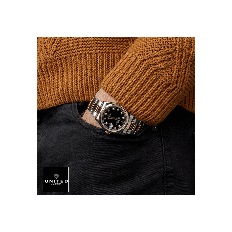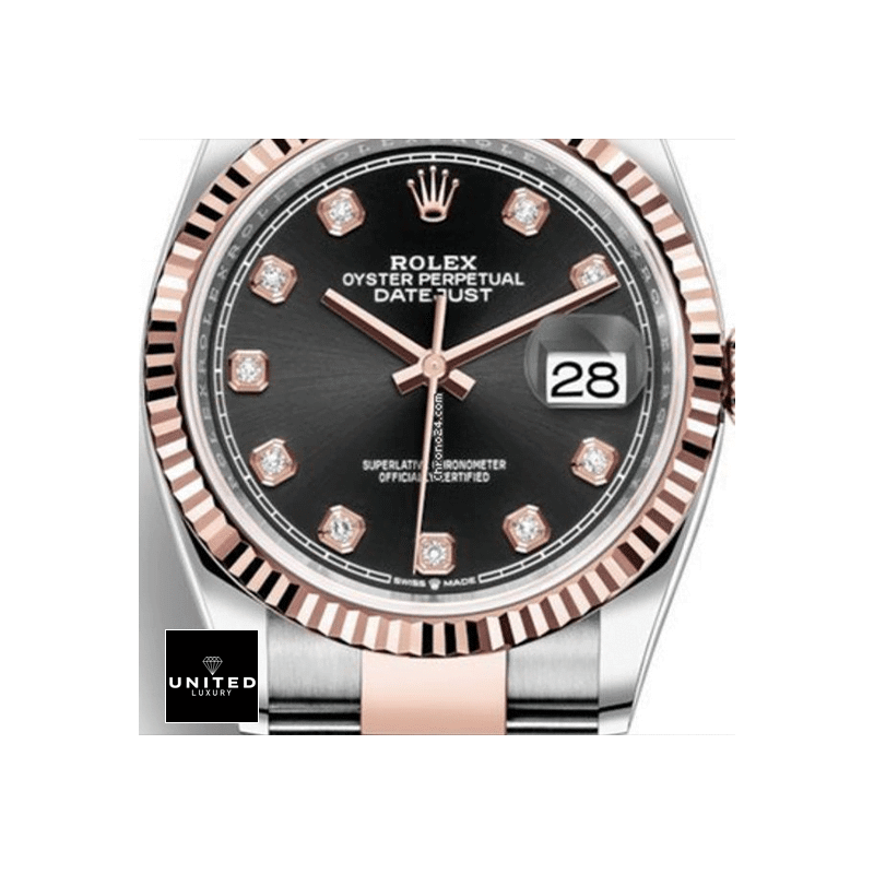 Introducing theRolex Datejust 126231 Black With Diamond Dial Replica. a masterpiece of horological craftsmanship and elegance. Designed to exude sophistication. this replica watch brings the timeless allure of the original Rolex Datejust to your wrist. embodying luxury and precision. Imagine the feeling of clasping this exquisite timepiece around your wrist. its weight and finish signifying a blend of tradition and innovation.Crafted with meticulous attention to detail. the Rolex Datejust 126231 Replica features a durable904L stainless steel case and bezel. accented with the resplendent rose gold. creating a harmonious balance of strength and beauty. The36.00mm sapphire crystaldial. coupled with dot indices and elegantly crafted stainless steel hour markers and hands. offers a sleek black backdrop that enhances readability and sophistication. Under the hood. this replica boasts anautomatic caliber 3255 movement. delivering an impressive 60-hour power reserve. keeping perfect time with a precision of -3/+3 sec/day. well within COSC certification limits.Every element of this watch speaks to quality and luxury. The bracelet. made of the same high-grade 904L stainless steel. features an oyster type design with adjustable links. ensuring a comfortable and secure fit for any wrist size. The gleamingfold clasp in rose gold and steeladds an extra touch of elegance and functionality. seamlessly integrating fashion with practicality.Water-resistant up to 30 meters. the Rolex Datejust 126231 Replica is built to withstand daily wear and occasional splashes. underscoring its robustness without compromising on style. Moreover. it comes with a full2-year international warranty. offering peace of mind and affirming its quality and durability. This precise 1:1 super clone Swiss mechanism watch is crafted so impeccably that even your jeweler would find it indistinguishable from the original.For those discerning individuals seeking the epitome of luxury without the exorbitant price tag. the Rolex Datejust 126231 Black With Diamond Dial Replica stands as a testament to refined taste and superior craftsmanship. With this timepiece. you’re not just wearing a watch; you’re making a statement. It’s an ideal choice for anyone looking to capture the elegance and reliability of a Rolex. without worrying about owning a Let this magnificent replica watch elevate your style and confidence. making every moment truly timeless.