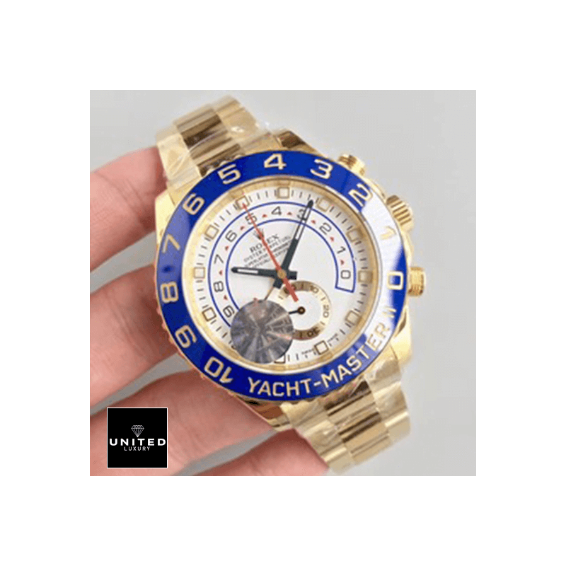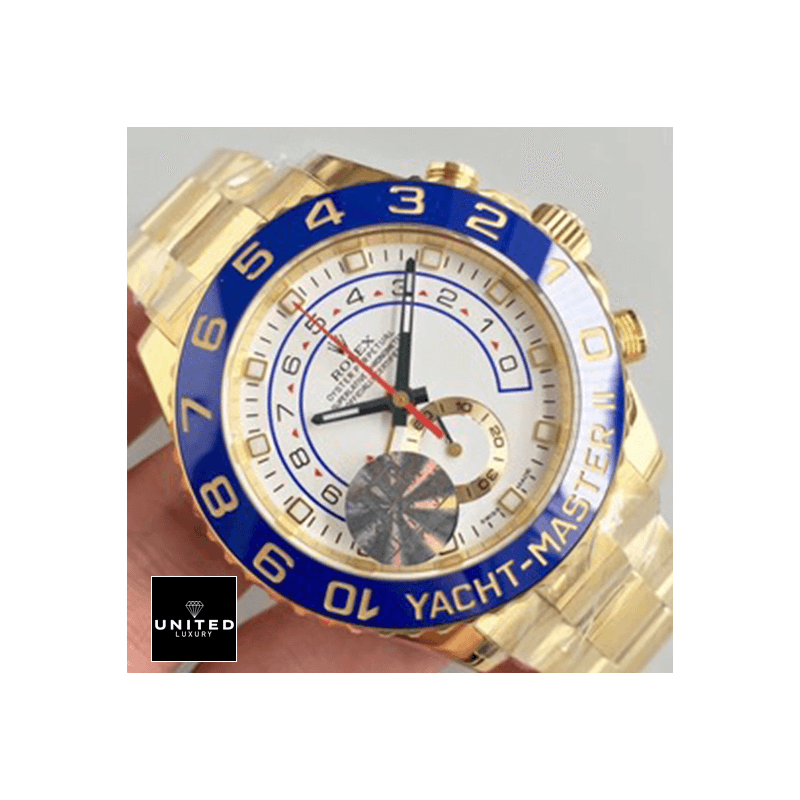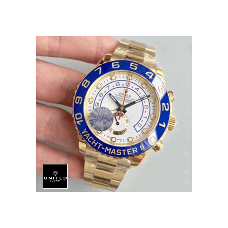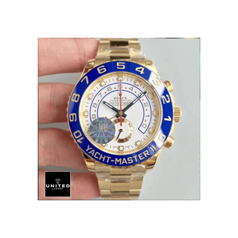 Introducing theRolex Yacht-Master 116688 II Yellow Gold Automatic Dial Oyster Replica. a dazzling masterpiece that embodies luxury and precision. This watch is not merely a timepiece; it’s an accessory that makes a statement of sophistication and refined taste. Designed to captivate. it features a904L stainless steel caseadorned with a sumptuous yellow gold finish and a vibrant blue ceramic bezel. creating a striking contrast that exudes elegance. The formidable 44.00 mm case. with a thickness of 14.00 mm. is perfectly complemented by a robust sapphire crystal. ensuring both durability and luxurious appeal.Imagine the feel of theOyster bracelet. also crafted from 904L stainless steel. wrapping comfortably around your wrist. This adjustable bracelet guarantees a perfect fit. enhancing your comfort as you wear this exquisite timepiece. The watch’swhite dial. adorned with stick and dot indices. is not just a sight to behold but also a marvel of engineering. Powered by anAutomatic 4161 caliber movement. it boasts a remarkable 60-hour power reserve and an extraordinary precision of -3/+3 seconds per day. all within the stringent COSC certification limits.TheRolex Yacht-Master 116688 II Yellow Gold Automatic Dial Oyster Replicais equipped with sophisticated functions such as a chronograph. column wheel. and countdown features. making it a versatile tool for both everyday wear and special occasions. Its 30m water resistance provides an added layer of protection. ensuring that this watch is ready for any adventure. Moreover. it comes with a comprehensive 2-year international United Luxury warranty. offering peace of mind for your investment.This watch is a perfect1:1 super clone Swiss mechanismpiece. meticulously designed to mirror the original in every aspect. from arrangeable serial numbers and precise font application to the immaculate finishing of writings and markings. Whether you’re a seasoned collector or new to luxury timepieces. theYacht-Master 116688 II guarantees to impress with its unparalleled design and craftsmanship.Every glance at this watch will remind you of its intricate artistry and heritage. With a Rolex Yacht-Master on your wrist. you’re not just wearing a watch; you’re wearing a legacy. Indulge in the luxury and precision of theRolex Yacht-Master 116688 II Yellow Gold Automatic Dial Oyster Replicatoday. and experience the epitome of elegance and functionality intertwined in perfect harmony.