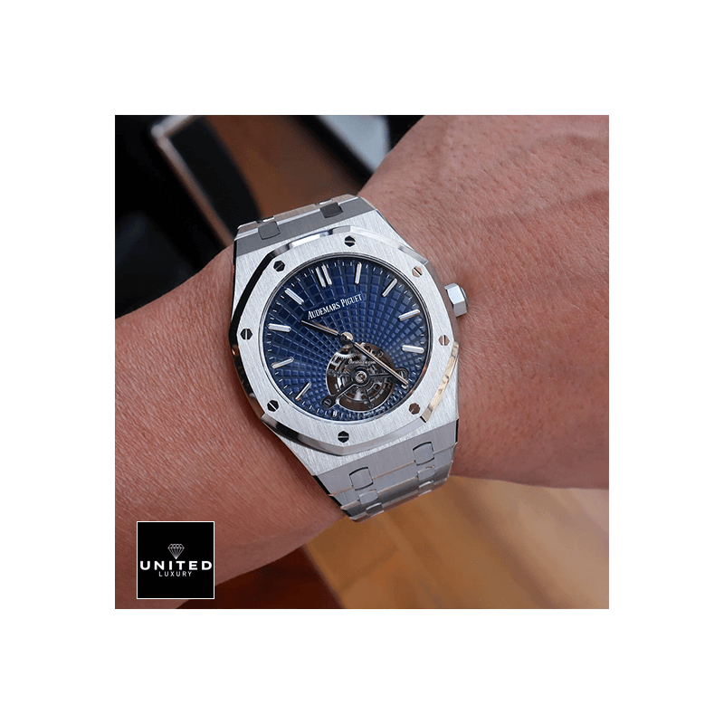 The Royal Oak Tourbillon Blue Replica from Audemars Piguet is a striking watch. It features an automatic movement with a caliber AP 2924 and a power reserve of 60 hours. The case is made of stainless steel and has a ceramic and stainless steel bezel. The crystal is sapphire and the size is 41.00 mm with a thickness of 9.00 mm. The bracelet is stainless steel with an adjustable link and a folding clasp.The dial is nicknamed Tapisserie Evolutive and is blue in color. The hour markers are ceramic and classic in type. while the hands are stainless steel and stick-shaped. The watch has a tourbillon escapement and is water-resistant up to 30m. It also comes with a 2-year international warranty and is a perfect 1:1 clone of the original. All the markings and writings are the same as the original. making it indistinguishable from the genuine watch.