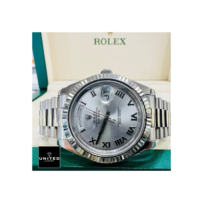 Step into the world of timeless elegance and unparalleled craftsmanship with theRolex Day-Date II 218239 Grey Roman Dial Replica. This meticulously crafted masterpiece embodies a perfect blend of sophisticated design and cutting-edge technology. Imagine adorning your wrist with an exquisite piece that not only captures the essence of luxury but also showcases an unparalleled attention to detail. Each angle reflects the ethereal beauty of the white gold-colored 904L stainless steel case. glistening under different lights and adding a touch of opulence to your every gesture.Thegrey dialembellished with Roman numerals and 904L stainless steel stick hour markers invites you into a world of refined simplicity. As your eyes trace the sophisticated curves of the timepiece. the sapphire crystal seamlessly integrates to protect the dial. offering a clear view of the meticulously designed face. The adjustable 904L stainless steel bracelet. designed for any wrist size. assures a perfect. comfortable fit. making it not only a joy to behold but a delight to wear.Powered by an automatic 3156 caliber movement. this watch promisesprecisionthat’s nothing short of remarkable. With a 60-hour power reserve. you can trust that the Rolex Day-Date II replica will keep accurate time with an impressive precision of -3/+3 seconds per day. adhering to stringent COSC certification limits. Designed to withstand the elements. it has passed the 30m water resistance test. ensuring durability and peace of mind under various conditions. Whether you’re attending a high-profile business meeting. dining in an upscale restaurant. or simply enjoying a day out. the full 2-year international United Luxury warranty guarantees you can wear this timepiece with absolute confidence.Drawing inspiration from one of the most iconic watch pieces. thissuper clone Swiss mechanism watchmirrors the original so closely that even a seasoned jeweler might find it challenging to distinguish between the two. Its authentic appearance and reliable performance make it an exceptional alternative to a genuine Rolex Day-Date II. Dare to elevate your style and exude an aura of sophistication with a watch that reflects your taste for luxury without compromise. Experience the touch of cold. polished metal. the smooth glide of the sweeping second hand. and the brilliance of athat achieves the apex of replication.Embrace the artistry and mechanical excellence of the Rolex Day-Date II 218239 Grey Roman Dial Replica. It is not just a watch; it’s a statement of elegance. reliability. and prestige – making it the best choice for those who seek the zenith of replicated luxury.
