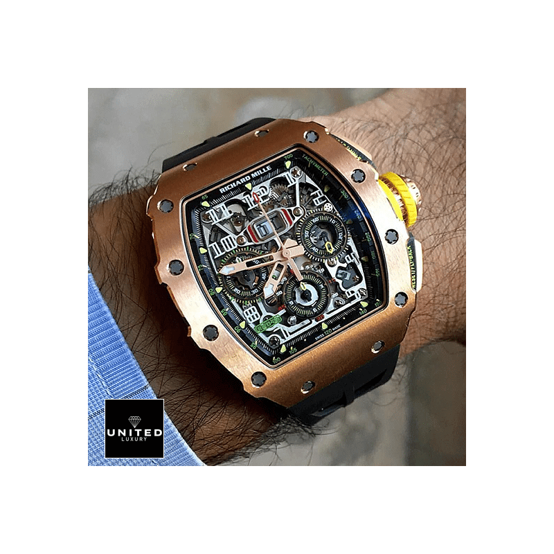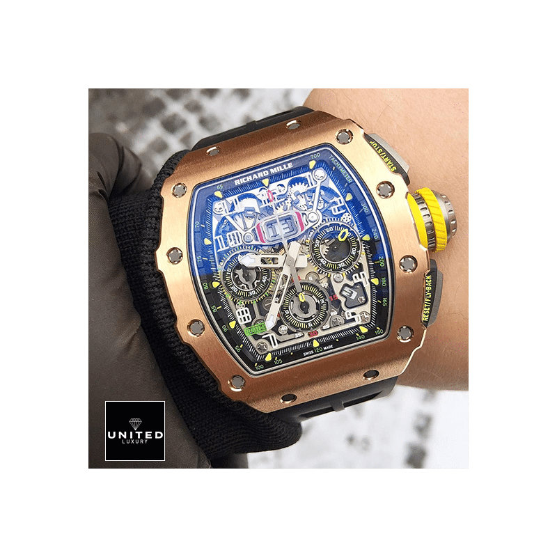 The Richard Mille RM 011-03 Rose Gold Flyback Chronograph Automatic Replica is a luxurious watch that is sure to turn heads. It features a 904L stainless steel case with a rose gold color and a skeleton design. The bezel is also made of 904L stainless steel and is rose gold in color. The crystal is a sapphire crystal and the size is 50.00 mm with a thickness of 16. mm. The bracelet is made of rubber and is adjustable for all sizes. It has a double-fold clasp made of 904L stainless steel and is rose gold in color.The dial is transparent and features Arabic numerals as indices. The hour markers are made of 904L stainless steel and are in the form of numbers. The hands are made of 904L stainless steel and are in the form of sticks. The movement is an automatic RMAC3 caliber with a power reserve of 60 hours and a precision of (-3/+3 sec/day) within COSC certification limits. It has passed the 30m water resistance test and is protected by a full 2 years International United Luxury warranty. This watch is a perfect replica of the original and is sure to impress.