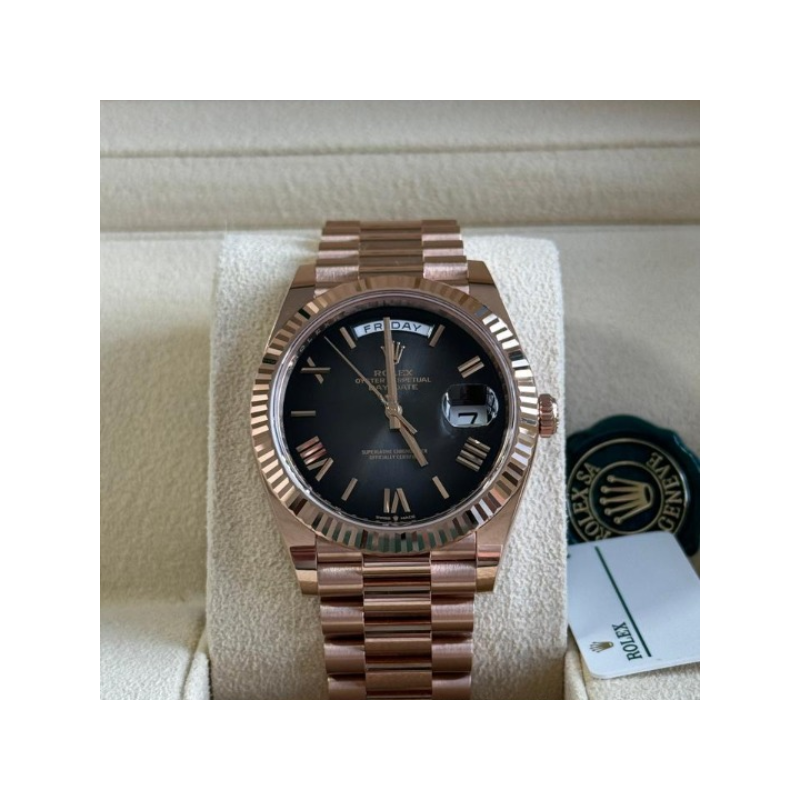 The Rolex Day-Date 40 Black Smoke Dial Replica is a stunning embodiment of sophistication and precision. crafted for the discerning individual who values both form and function. Imagine the gleam of the 904L stainless steel case catching the light. exuding a timeless elegance that is unmistakably Rolex. The sapphire crystal dome not only offers a clear. unblemished view of the captivating black smoke dial but also provides exceptional scratch resistance. ensuring that your timepiece remains as immaculate as the day you first laid eyes on it.As you slip it onto your wrist. you immediately notice the meticulous attention to detail: the 904L stainless steel bracelet is both sturdy and refined. with an adjustable link that ensures a perfect. comfortable fit for any wrist size. The dial. a mesmerizing shade of black smoke. features Arabic indices that stand out with bold clarity. each hour marker and hand crafted from premium stainless steel. This rolex arabic dial replica captures every nuance of the original design. creating a true 1:1 clone that is virtually indistinguishable from the authentic model.At the heart of this masterpiece lies the automatic caliber 3255 movement. a marvel of watchmaking technology with a remarkable power reserve of 60 hours. The flawless sweep of the second hand and the precision within COSC certification limits (-3/+3 seconds per day) promise impeccable timekeeping. This Rolex replica is also water-resistant up to 30 meters. providing peace of mind whether you’re caught in a downpour or simply washing your hands.Every aspect of the Rolex Day-Date 40 Black Smoke Dial Replica speaks to its unparalleled quality and craftsmanship. The markings. the size. the thickness. and even the font mirror those of the original. delivering an experience that is as close to owning a genuine Rolex as possible. Backed by a full 2-year international warranty. this watch is not just a purchase but an investment in style and reliability.When you wear the Rolex Day-Date 40 Black Smoke Dial Replica. you are not just telling the time; you are making a statement about your commitment to excellence. This isn’t merely a watch—it’s a conversation piece. a testament to your refined taste and appreciation for the finer things in life. If you’re in search of a rolex arabic timepiece that embodies luxury. precision. and durability. look no further. These exceptional Rolex replicas knows no equal.