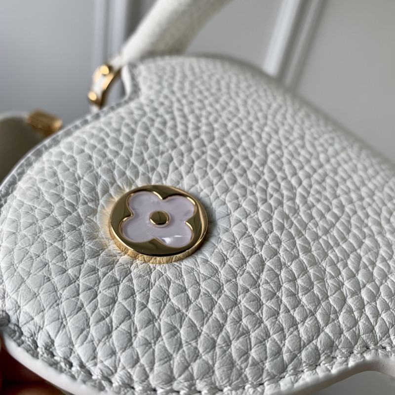 The Capucines small Flower Crown bag in full-grain Taurillon leather is embellished with Monogram floral motifs, each shaped from a delicate shell, while the LV logo echoes the floral motifs, giving this feminine bag a jewel-like sheen. Use the detachable shoulder strap to carry the bag over the shoulder or across the body.