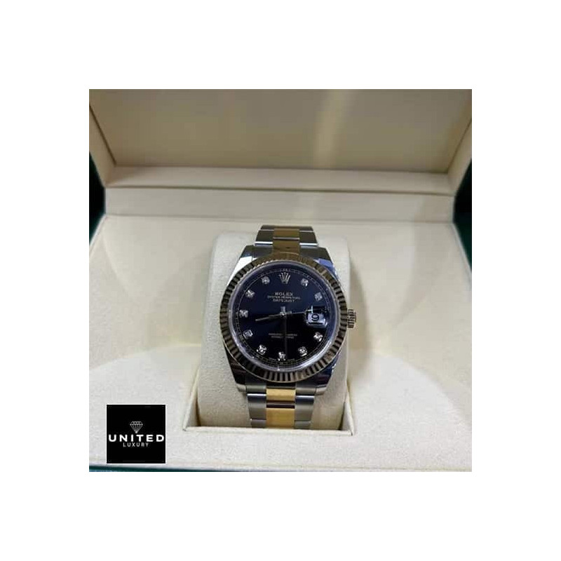 The Rolex Datejust 126333-0005 Yellow Gold & Steel Automatic Black Dial Oyster Replica is a high quality watch. It features a 904L stainless steel case with a yellow gold and steel bezel. a sapphire crystal. and a 41.00 mm size. The movement is an automatic caliber 3235 with a 60-hour power reserve and a precision of (-3/+3 sec/day) within COSC certification limits. The bracelet is a 904L stainless steel oyster with adjustable links and a folding clasp in yellow gold and steel. The dial is black with gem-set indices and 904L stainless steel stick hour markers and hands.The watch is water-resistant up to 30m and comes with a full 2-year international United Luxury warranty. It is a perfect 1:1 super clone Swiss mechanism watch. with the same arrangeable serial numbers and cards. font. punto. and finishing for writings and markings. thickness. size. and powerful movement and caliber. Your jeweler won’t be able to tell the difference!